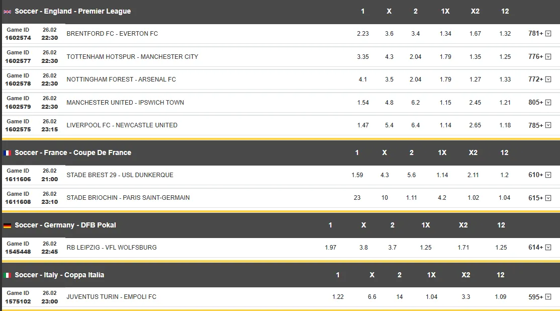 Popular leagues may be a smart solution for those who don’t know what to start with. The top leagues are associated with football and are suggested separately. Some of the options here include Premier League, Bundesliga, UEFA Champions League, and so on. The number of actual games is offered next to the league.